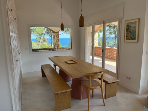 Fabricación de mesa y bancos en contrachapado de roble con medidas personalizadas, y suelos de microcemento.