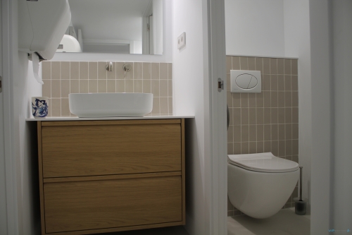 Baño para oficinas con inodoros separados elementos estandarizados y sobres de solid surface adaptados a ancho entre paramentos
